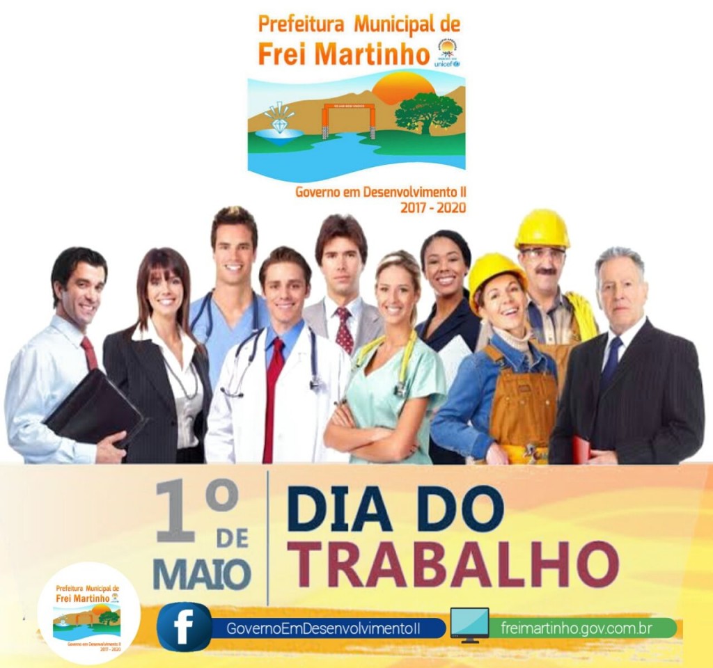 O Dia do Trabalho, também conhecido como Dia do Trabalhador, é comemorado em 1º de maio. No Brasil e em vários países do mundo é um feriado nacional, dedicado a festas, manifestações, passeatas, exposições e eventos reivindicatórios e de conscientização. Nós que fazemos a Gestão Governo em Desenvolvimento aqui representada pelo Prefeito Constitucional Aguifaildo Lira Dantas e seu vice-prefeito Sebastião Pinto Dantas queremos deixar os nossos agradecimentos a todos os trabalhadores deste município que com seu esforço diário ajudam a construir uma Frei Martinho mais humana e mais acolhedora. “Temos uma gestão de sucesso porque temos o trabalhador fazendo o seu serviço com amor e com zelo não importando o setor que trabalha. Afinal, uma gestão participativa se faz com o esforço de todos”.