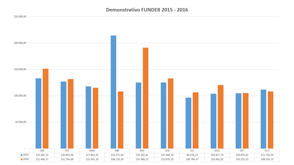 Este gráfico é um comparativo dos valores recebidos pelo FUNDEB no Município de Frei Martinho-PB entre os meses de Janeiro a Outubro nos anos de 2015 a 2016.