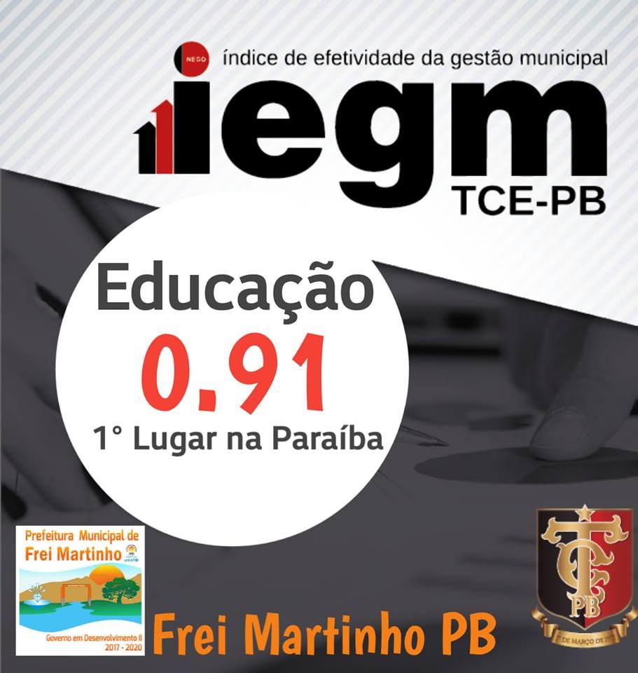 O Tribunal de Contas do Estado da Paraíba divulgou, o Índice de Efetividade da Gestão Municipal (IEGM) e a Gestão da Educação de Frei Martinho obteve 0.91, ficando em primeiro lugar na classificação geral dos 223 municípios da Paraíbanos.