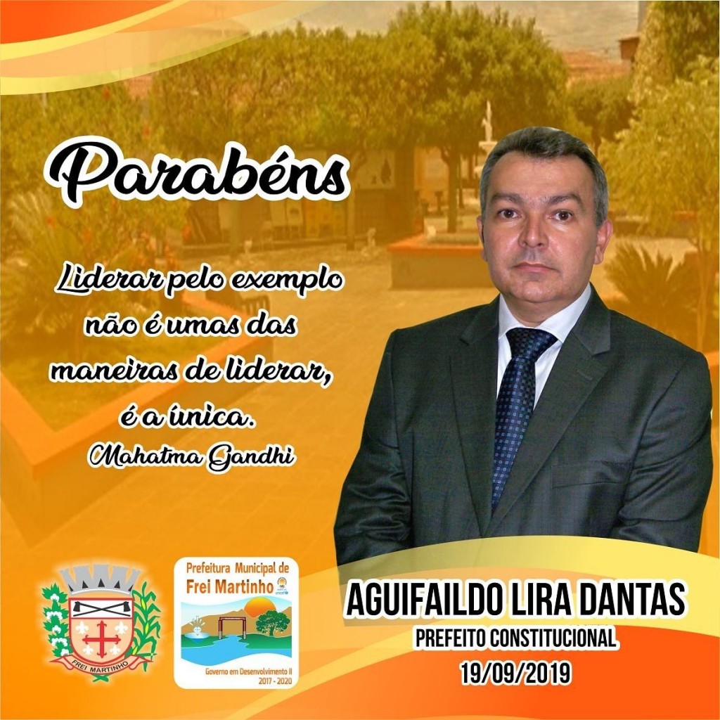 Os servidores públicos que trabalham no prédio da Prefeitura Municipal juntamente com o Vice-prefeito, vereadores e secretários municipais fizeram uma singela homenagem ao Prefeito Aguifaildo Lira Dantas por ocasião de seu aniversário neste dia 19/09. Aido como é popularmente conhecido é o filho mais novo de uma família de 04 (quatro) irmãos e filho do ex-prefeito Aguitônio Dantas que também foi prefeito por 02(dois) mandatos no município de Frei Martinho. Em sua trajetória política, Aido já exerceu o cargo de vereador em 02 (dois) mandatos, nos quais atuou como presidente da Câmara, foi vice-prefeito e prefeito eleito por (02) dois mandatos consecutivos. \"Todos nós servidores públicos que trabalhamos no município de Frei Martinho, te desejamos um Feliz Aniversário\"