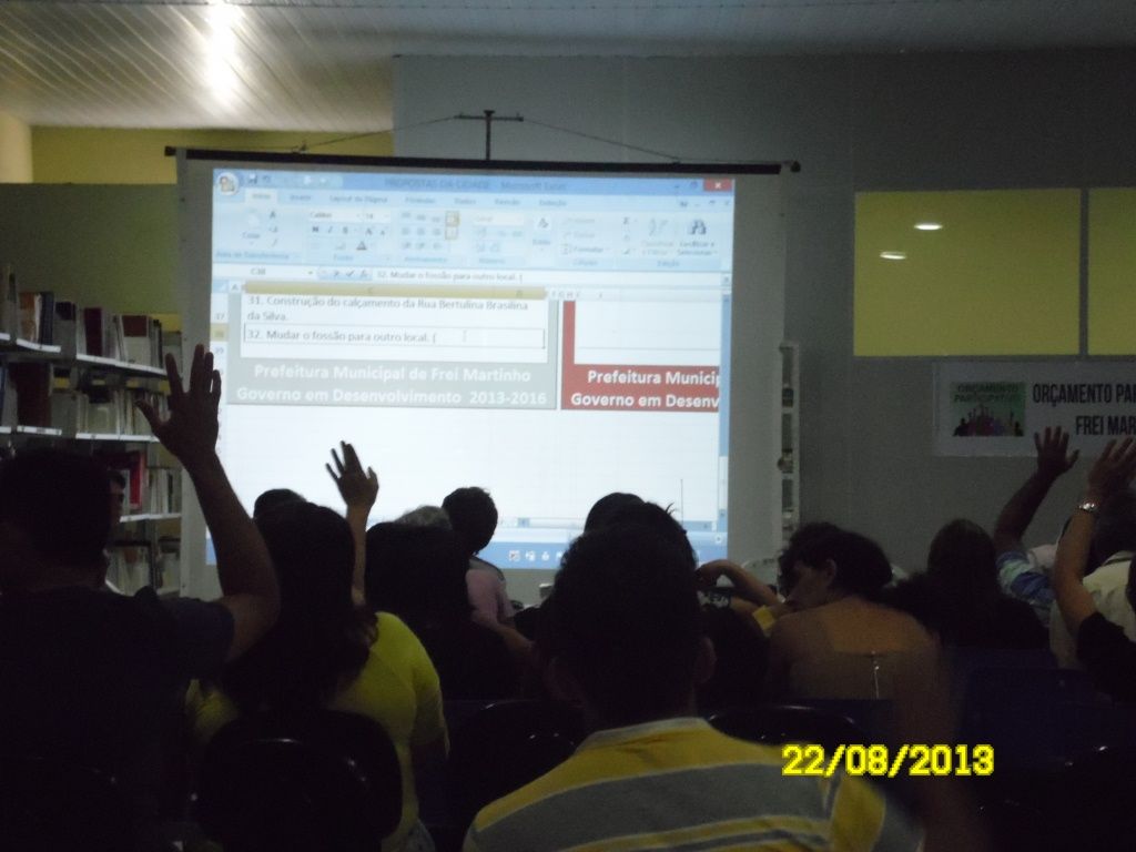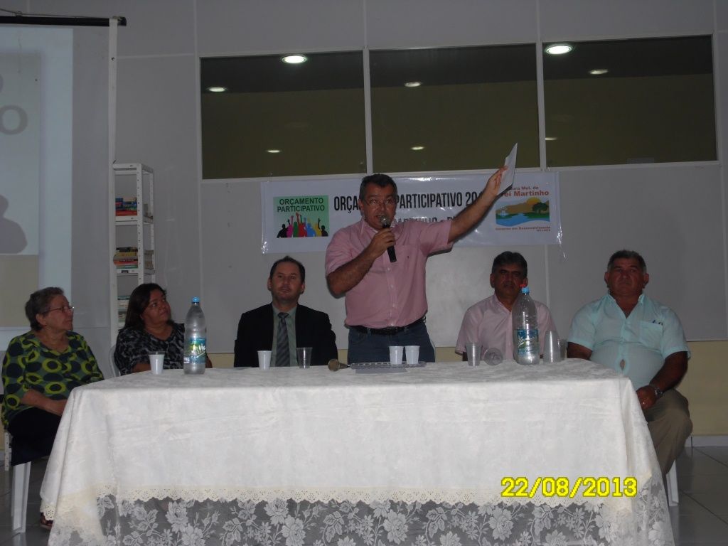 O Prefeito Aguifaildo Lira Dantas e o Vice Sebastião Pinto Dantas realizaram o encerramento do Orçamento Democrático na cidade de Frei Martinho, na noite de quinta-feira (22), 2014/2017, na Biblioteca Pública Municipal Augusto dos Anjos, onde teve grande participação popular. A população participou da plenária e questionou, sugeriu e cobrou muitas melhorias para o município.