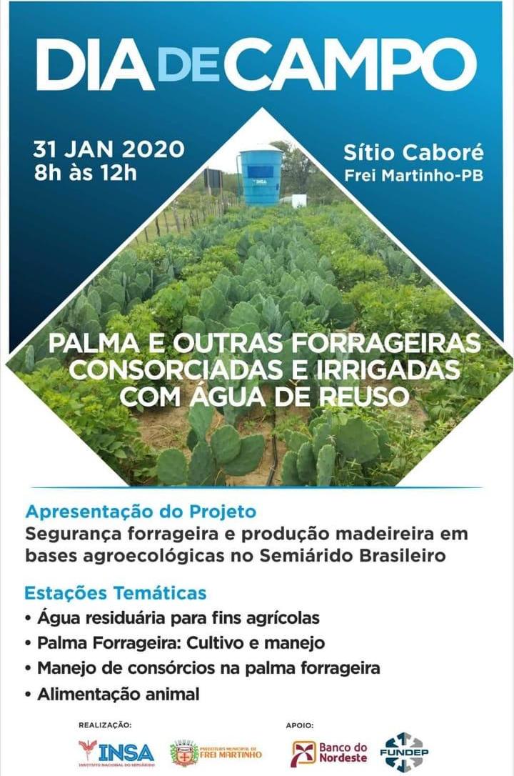O evento será realizado no Sítio Caboré, em Frei Martinho (PB), e está com início previsto para às 08 horas. Durante a oportunidade serão discutidos os seguintes temas: Água Residuária para fins agrícolas; Palma Forrageira: Cultivo e Manejo; Manejo de Consórcios na Palma Forrageira e Alimentação Animal.