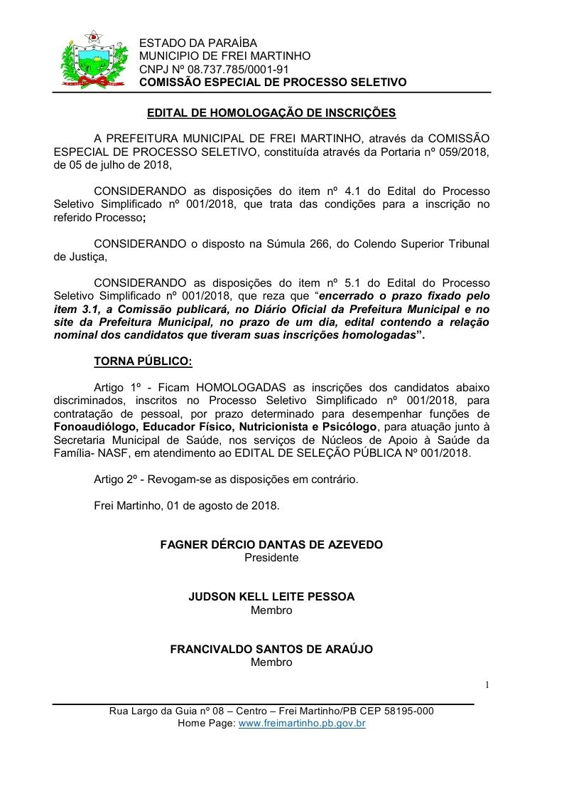 EDITAL DE HOMOLOGAÇÃO DE INSCRIÇÕES PARA PROCESSO SELETIVO DO NASF