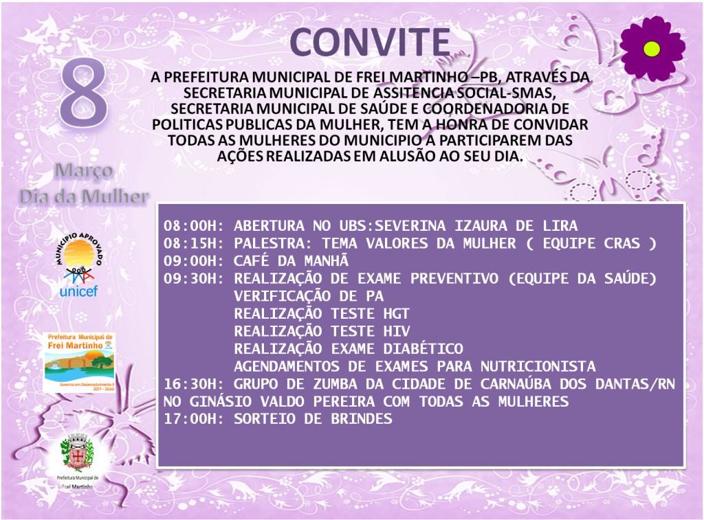 A Prefeitura Municipal de Frei Martinho-PB, por meio das Secretarias Municipais de Assistência Social-SMAS - Saúde e Coordenadoria de Políticas Públicas da Mulher, convidam todas as mulheres do município para participarem das ações realizadas nesta dia 08 de Março em alusão ao "Dia Internacional da Mulher".