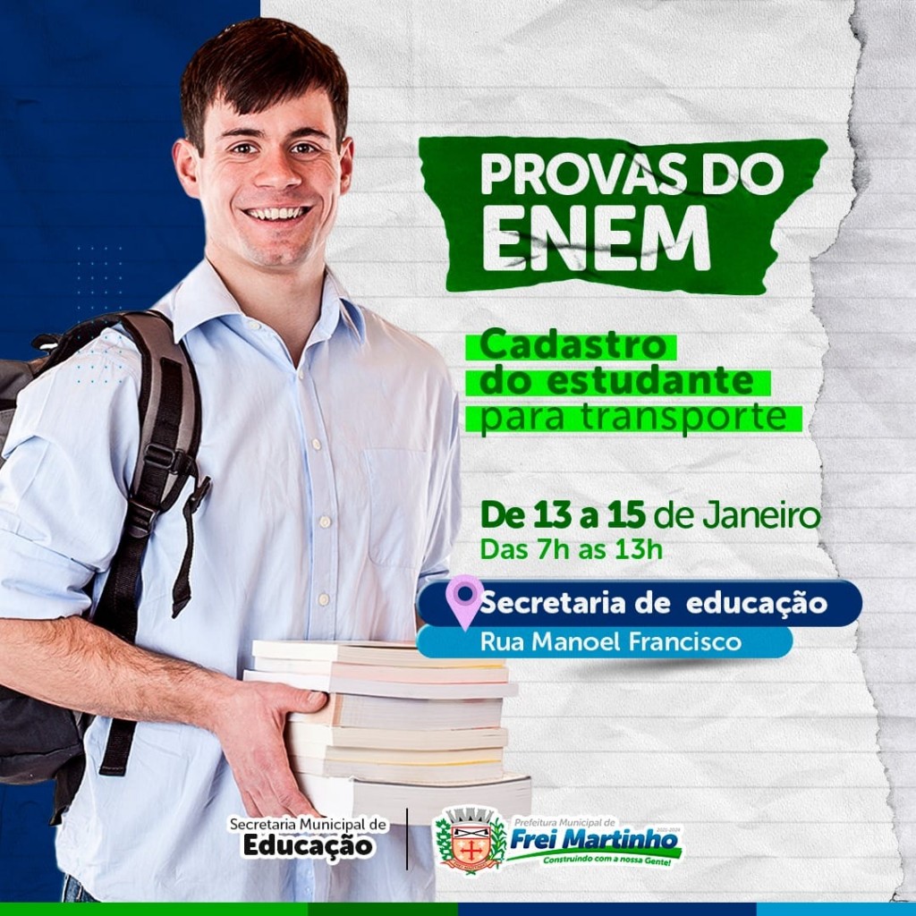A Prefeitura de Frei Martinho, através da Secretaria de Educação e Secretaria de Transportes, inicia cadastro de transporte para os estudantes que participarão do Exame Nacional do Ensino Médio 2021 (Enem), em Picuí, nos próximos domingos, dias 17 e 24 deste mês.