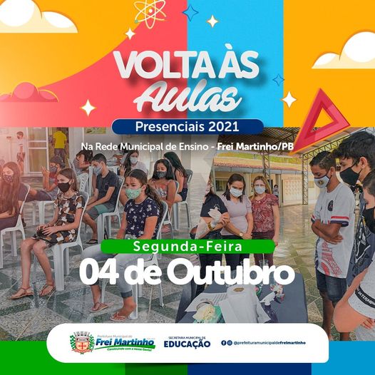 Na próxima segunda-feira, dia 04 de outubro, a Rede Municipal de ensino de Frei Martinho estará reiniciando as aulas presenciais de forma gradativa e escalonada, por meio da modalidade Híbrida. Toda equipe da Secretaria de Educação e escolar está pronta nos aspectos administrativo, pedagógico e de biossegurança, além de devidamente vacinada e testada contra a COVID-19, para receber parte dos alunos com segurança.
