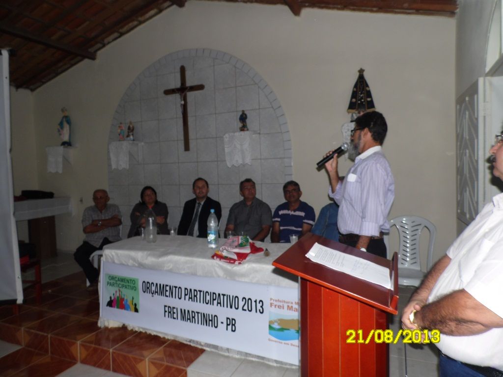 O Orçamento Participativo é um importante instrumento de complementação da democracia representativa, pois permite que o cidadão debata e defina os destinos de um município. Neste sentido, a Prefeitura Municipal de Frei Martinho, por meio do Prefeito Aguifaildo e do Vice Tião, realizam nas comunidades esta ação por acreditar que esta é a melhor forma de descentralizar ideias, dividir responsabilidades e sucessos. Este orçamento contemplará ações para o quadriênio 2014/2017 e terá como instrumento básico a opinião pública. Neste dia 21/08 o Prefeito Aguifaildo juntamente com autoridades e equipe responsável estiveram realizando o "Orçamento Participativo na Comunidade Quixaba" A audiência foi realizada, Na Capela de São Roque na comunidade Quixaba e contou com a participação de pessoas de diversos seguimentos da comunidade rural e urbana.