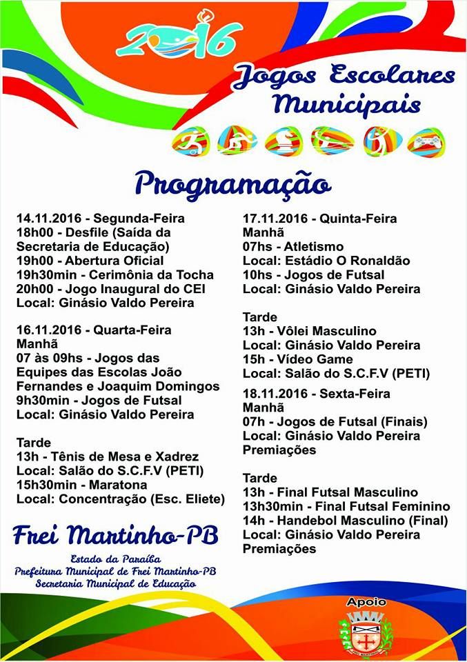 As Secretarias de Educação, Esporte, Cultura e Lazer em parceria com a Prefeitura Municipal promovem nesta semana (14 a 18/11) os Jogos Escolares Municipais 2016. O Evento que é uma tradição no município tem como objetivo incentivar a prática do esporte nas diversas modalidades entre os estudantes da Rede Municipal de Ensino. Muitos desses alunos já foram destaque no cenário estadual e nacional. Podemos citar como exemplo, Carlos Anderson, Jeane Cristina entre outros que despertaram para a prática do esporte enquanto eram alunos da rede municipal e hoje são referências para as crianças e jovens do município.